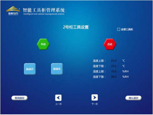 主頁數據顯示界面主要顯示的是各個柜子工具信息,包括柜內、外溫濕度、工具名稱、配備數量、距檢天數、在位數量、在位情況等信息。編號圖標顯示紅色則表示離位,綠色則表示在位。上下頁按鈕可進行各柜子頁面切換。該界面還配有開門、設置、查詢界面的按鈕。狀態一欄有自動、手動兩種狀態,表示的是此號柜中除濕機的工作狀態。自動狀態下,當溫、濕度達到設定的范圍值則除濕機會自動打開或者關閉。手動狀態下,可以強制打開或者關閉除濕機。